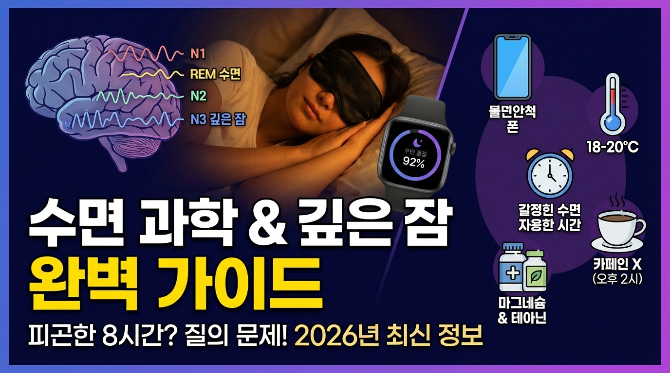 8시간을 자도 피곤하다면 시간이 아닌 질의 문제입니다. 수면 단계의 비밀부터 침실 온도·카페인 타이밍·수면 보충제·수면 추적법까지 — 2026년 최신 수면 과학을 바탕으로 완전 정리했습니다.