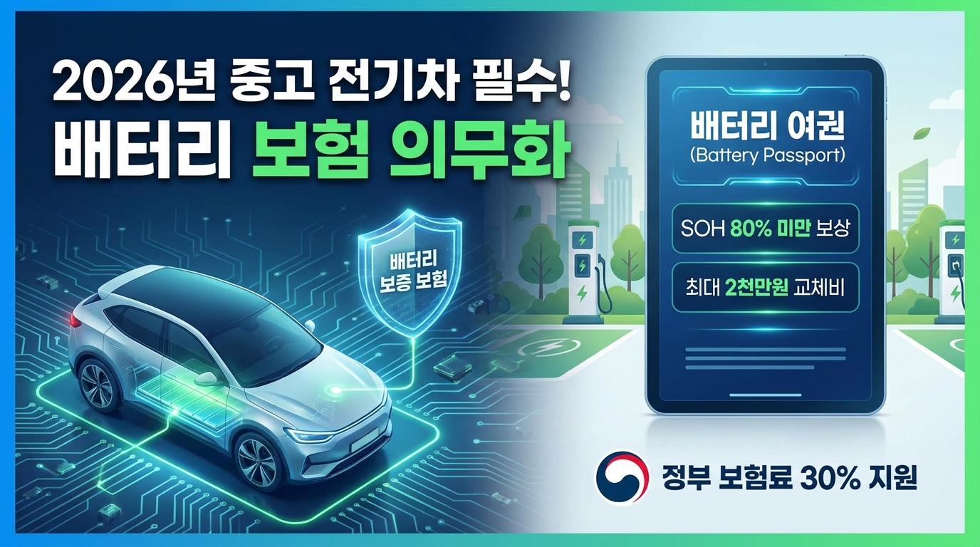 본 콘텐츠는 2026년 기준 국토교통부의 '전기차 배터리 안전 및 소비자 보호를 위한 보험 의무화 시행령' 및 배터리 여권 제도를 바탕으로 소비자의 권리 보호를 위해 작성되었습니다. 배터리 고장 시 실제 보상 가능 여부와 30% 지원금 한도, SOH(잔존수명) 측정 기준은 개별 손해보험사의 약관 및 수리 현장의 판독 결과에 따라 변동될 수 있습니다. 가입 전 반드시 보험사의 공식 약관과 국토부 세부 고시를 직접 확인하시기 바랍니다.